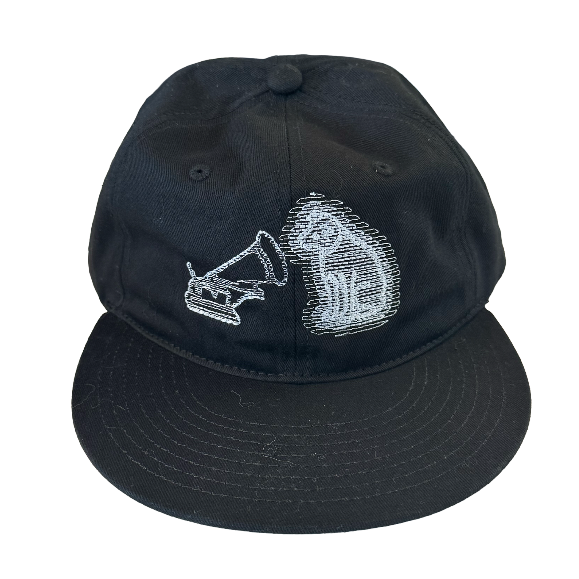 - Black cotton hat, white embroidery thread